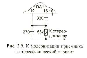 Этот приемник легко превратить в стереофонический, немного изменив номиналы некоторых радиоэлементов и добавив новые, как показано на рис. 2.9.